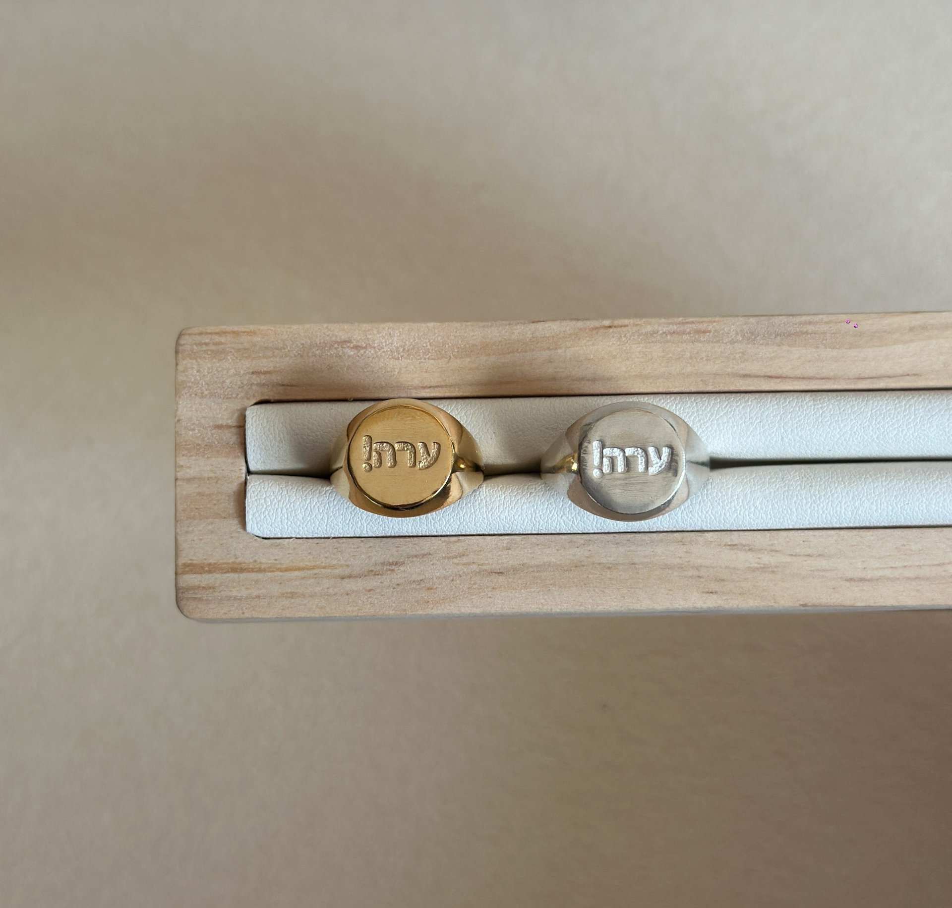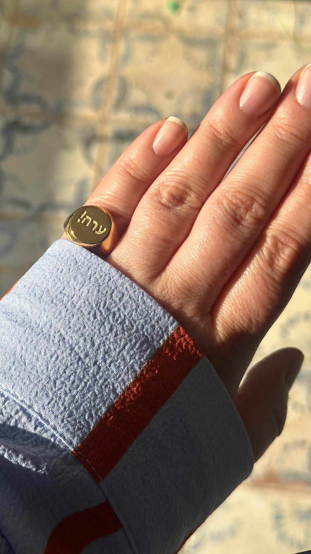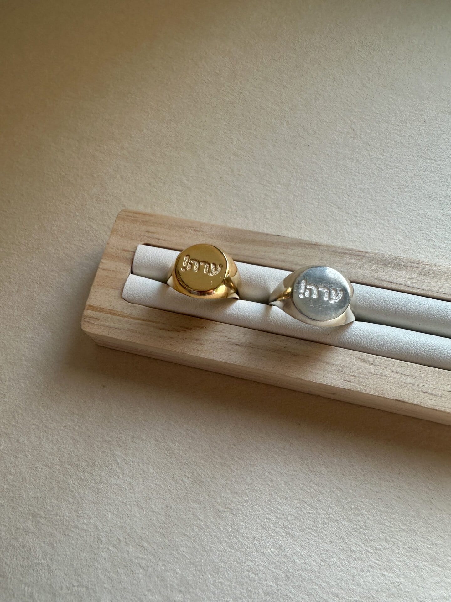 טבעת סיגנט עגולה עשויה כסף סטרלינג 925, קיימת גם באופציה של כסף בציפוי זהב, עם חריטה ברורה של המילה ״ערה!״.