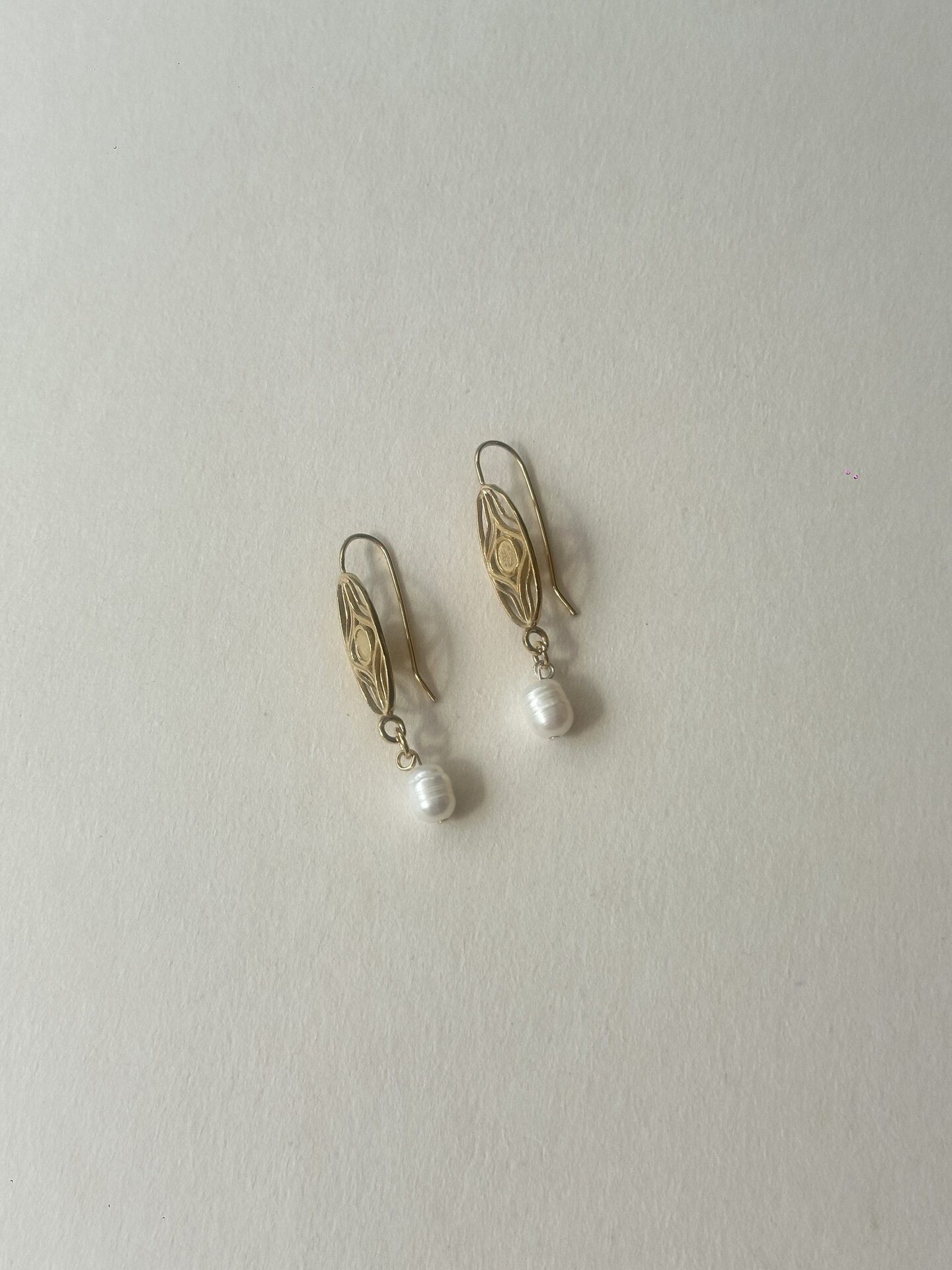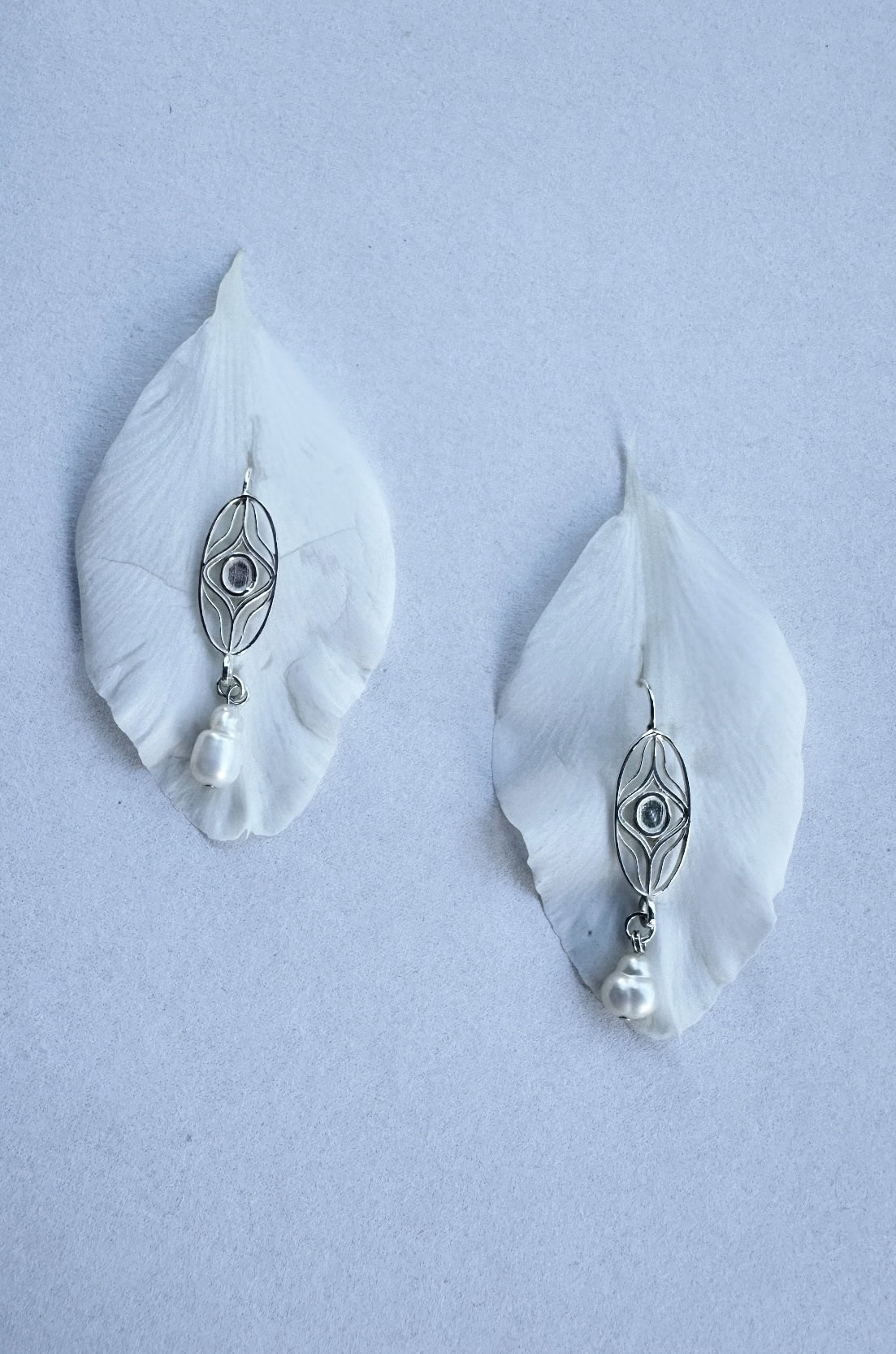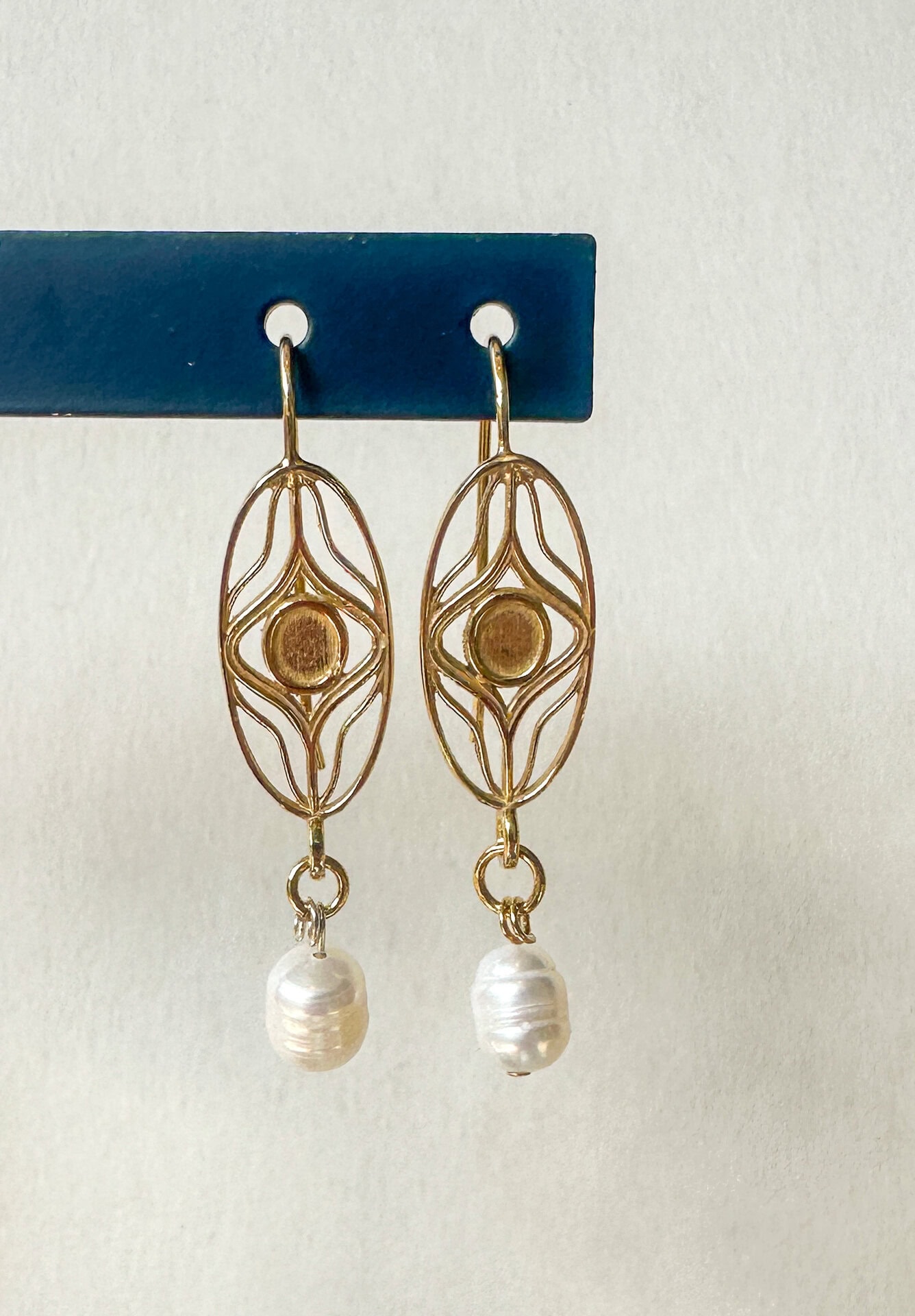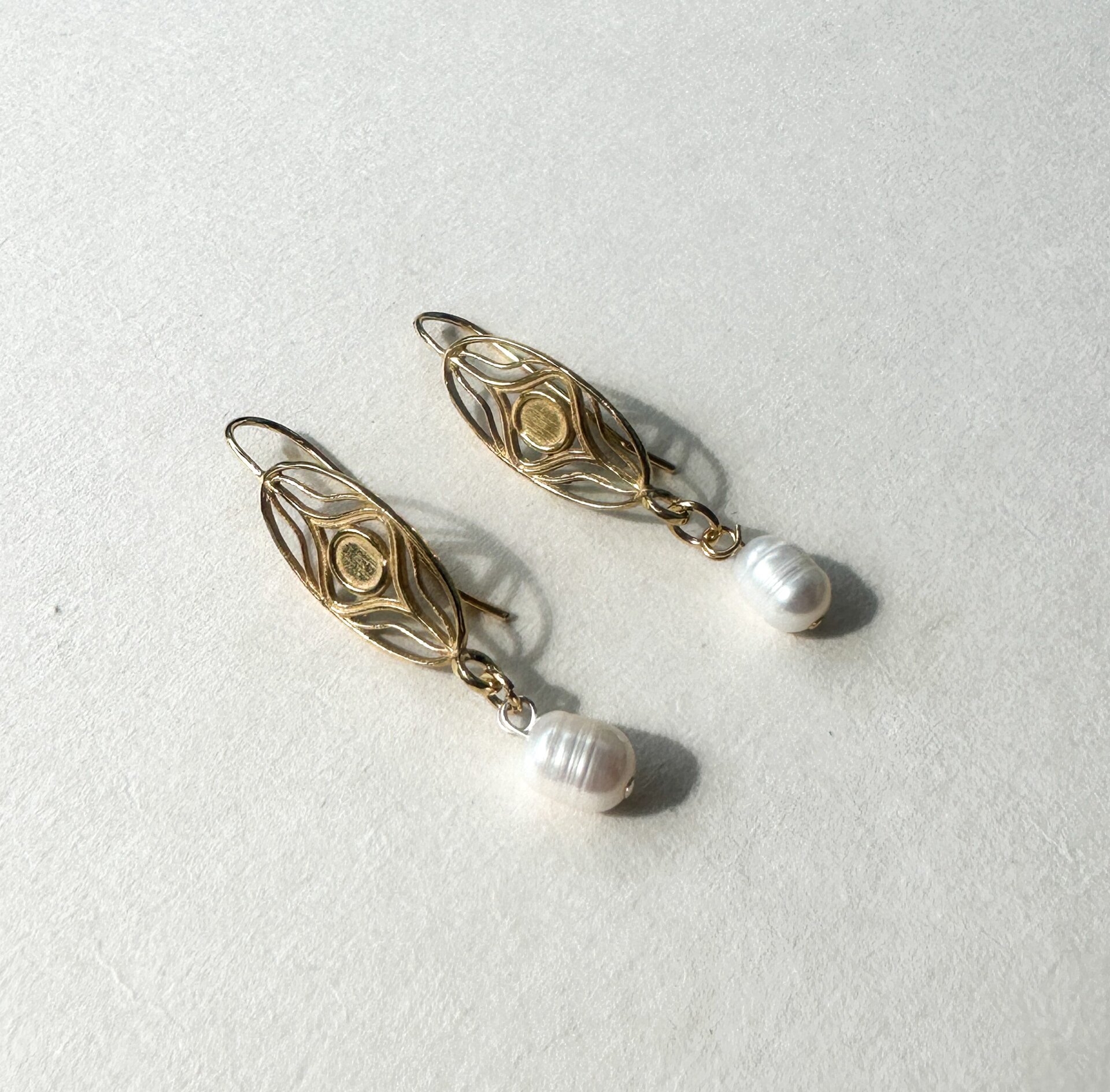 עגילים עדינים ומלאי נוכחות, בעיצוב אליפטי פתוח עם פנינה טבעית המשתלשלת בקצה- שילוב של אלגנטיות, רוך ועוצמה.