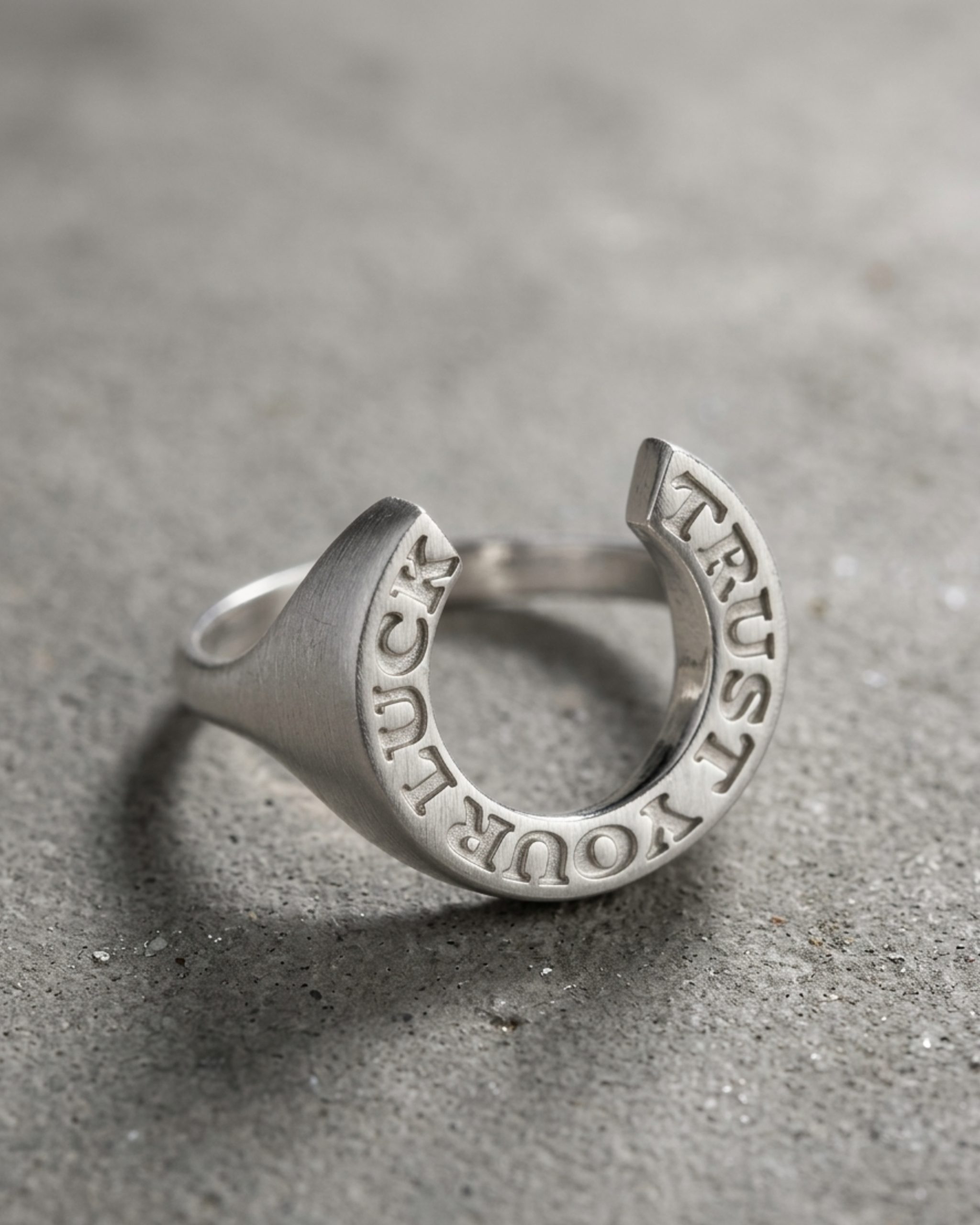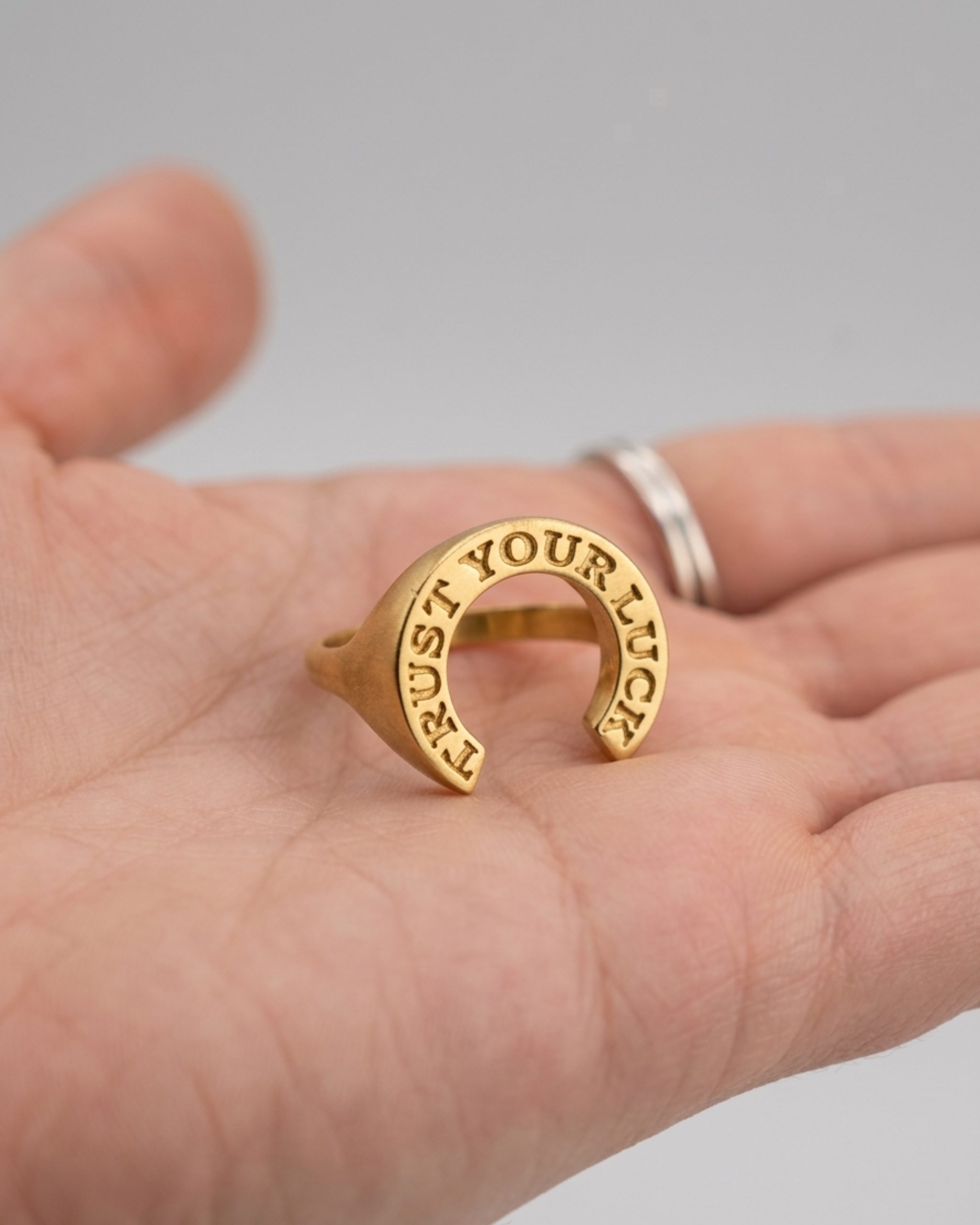 יש משהו בטבעות חותם שנותן מיד אטיטיוד. טבעת הפרסה הזו נולדה מתוך רצון ליצור קמע למזל שיש לו חספוס. עיצבתי אותה כפיס יוניסקס- היא תשב בול על האצבע שלך, ותיראה פסיכי לא פחות על היד שלו. חריטה בולטת של Trust your luck שמזכירה למי שעונד/ת אותה פשוט לשחרר, לנשום ולסמוך על הדרך.